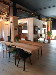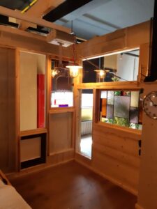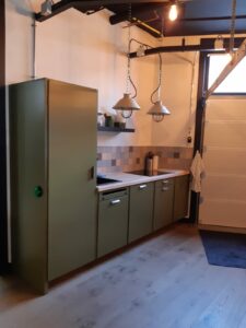 Sam heeft uiteraard ook zijn steentje bijgedragen aan het ontwerp want hij vond sommige ideeën toch wel wat meisjesachtig, dus hier en daar wat aangepast. We hebben heel veel materialen en spullen hergebruikt, kasten geschilderd in dezelfde kleur als de keuken, oude deuren en ramen voor de wanden van de slaapkamer en er zit nog 1 origineel kozijn in de huiskamer. De timmerman heeft het wat opgeknapt, maar zoveel mogelijk in oorspronkelijke staat gelaten.