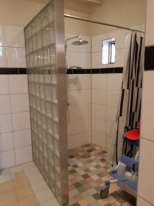 Eind februari ging Sam overdag naar zijn ”huis” om daar te werken, maar vooral om te wennen aan de ruimte, de geluiden en om het gevoel van thuis te krijgen. Niet lang daarna kon er ook gedoucht worden want alles was er immers en ook nog veel mooier en ruimer dan bij ons; een ruime inrijd douche en een grote vaste commode. Dus in de ochtend in pyjama naar de overkant, douchestoel mee en rond het avond eten weer terug omdat hij nog wel bij ons sliep. Een hoop ‘ge-heen-en-weer’. Zo rond zijn verjaardag heeft Sam het besluit genomen om op 1 mei helemaal te verhuizen. We hadden nog een maand om aan het idee te wennen en om de laatste belangrijke aanpassingen af te maken. Denk hierbij aan zaken als de intercom en bediening van de roldeur. Het is immers belangrijk dat hij zelfstandig naar buiten en binnen kan en dat hij zelf mensen binnen kan laten. Hij heeft een bel met camera dus hij kan zijn eigen deurbeleid bepalen, gelukkig hebben wij een sleutel…
